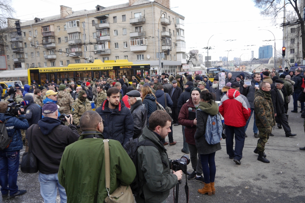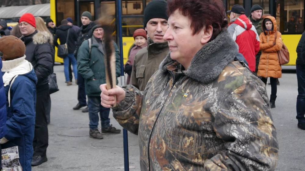 Над головами хтось з бійців намагається передати Геращенку військовий квиток показуючи, що є учасником АТО, але офіційно не оформлений. Час від часу з мікрофоном виступають матері бійців з різних батальйонів, які, за їхніми словами зараз перебувають в оточенні. В цей же час колони тролейбусів в обидва напрямки стоять порожні. Кілька автомобілів "Айдару" перекрили рух транспорту. Пускають лише карети швидкої допомоги.