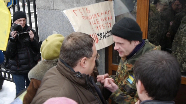 До мітингуючих вийшов радник Міністра внутрішніх справ України Антон Геращенко. Люди одразу оточили чоловіка щільним кінцем. жінки тримають імпровізовані плакати з написами "Геть Порошенка, Яценюка і Ярему. Вони зрадники".