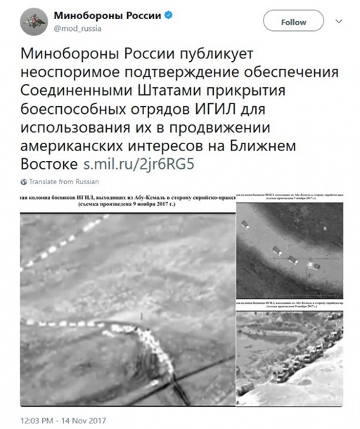 Раніше у вівторок Міноборони РФ розмістило в соцмережі пост із твердженням, що в його розпорядження надійшло "незаперечне підтвердження" забезпечення США прикриття загонів ІДІЛ. Під постом відомство опублікувало фотографії, які нібито це доводять.