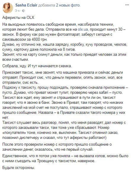 "Дзвоню в "Приват", там кажуть, що ніяких зарахувань на мій рахунок не надходило. Таксист слухає всю розмову, зрозумів, що мене розводять, дав номер з якого замовляли таксі, там теж вже скидають. Номер "покупця" теж, звичайно ж, вимкнений... Після цього перевірили номер з якого прийшло повідомлення про зарахування грошей, виявилося, що не перший випадок. Будьте обережні", - резюмувала вона.