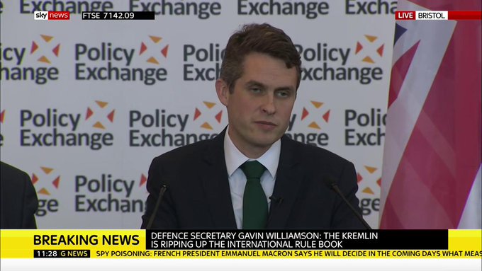Міністр оборони Великобританії Гевін Вільямсон порадив Росії "відійти і заткнутися", а не готувати заходи щодо вислання російських дипломатів із Лондона. Про це Вільямсон сказав журналістам у четвер, 15 березня, повідомляє Sky News.