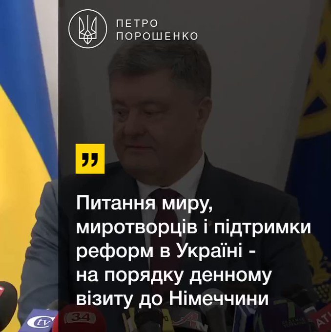 "У понеділок я вирушаю до Німеччини. Це одна з перших зустрічей нового німецького уряду з пані канцлером. Я дуже вдячний за ті пріоритети, які вона виставляє, й Україна дуже високо в пріоритетах Німеччини. Як приклад можна сказати, що в коаліційній угоді німецького уряду питання України, питання миротворців є ключовим. Там буквально п'ять-шість країн згадано, і це дуже символічно така пріоритезація важливості України для Німеччини як лідера Європейського Союзу", - заявив президент.