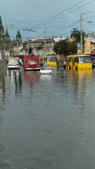 "Повертаюсь із роботи додому, - розповідає 26-річна Юля Катинська. - Застрягла на вулиці Сахарова. Рух паралізований. Громадський транспорт стоїть. Магазини - затоплені. Перейти вулицю нереально - води по пояс. Якийсь добродій витяг із дому надувну лодку та переправляє людей на протилежну сторону Сахарова. І смішно, і грішно".