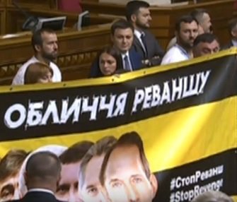На 2 банері під написом "Обличчя реваншу" - фотографії Путіна, олігархів Дмитра Фірташа та Ріната Ахметова, нардепів із "Опозиційного блоку" Сергія Льовочкіна та Вадима Новинського.