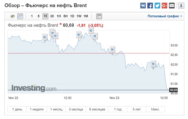 Як зазначає Інтерфакс, ціна на нафту опустилася нижче за $61 за барель вперше з листопада 2017 року. Протягом дня котирування на Brent впали нижче від рівня підтримки 38,2% по Фібоначчі ($62,27 за барель), що є ще одним сигналом можливості подальшого обвалу цін.