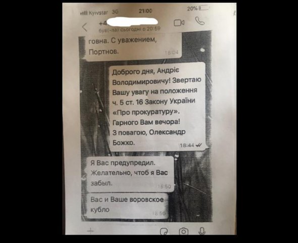 Божко розповів виданню, що одразу після того, як він намагався зв'язатися зі свідком у цьому провадженні, на його телефон прийшло повідомлення: "Доброго дня. Бачу, ви занадто активний. Виховні заходи доведеться вжити. Ще раз почую ваше прізвище, буду перетворювати на шматок лайна. З повагою, Портнов".