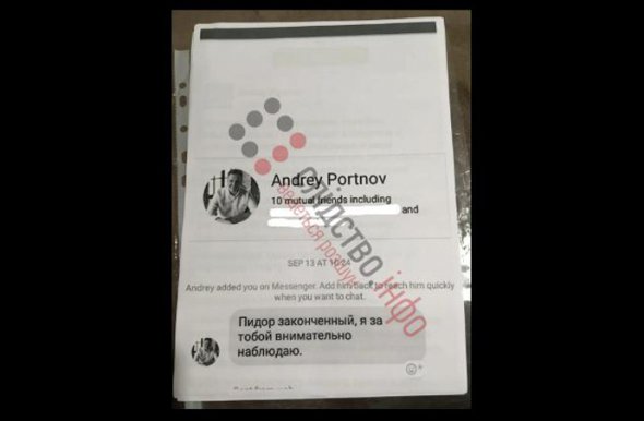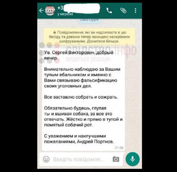 Два роки тому у вересні, слідчий отримав таке повідомлення: "П…р, я уважно спостерігаю за тобою. Спитаю з тебе. На мотузці будеш ходити по клітці. Портнов".
