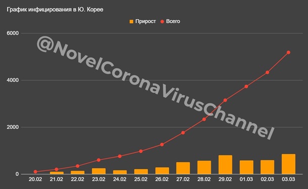 14:18 Графік з динамікою поширення коронавірусу в Південній Кореї, де за останню добу було виявлено понад 850 нових випадків зараження.