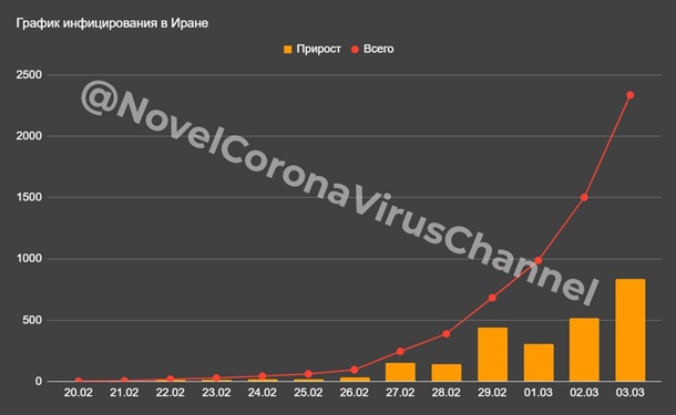 15:06 Графік динаміки поширення Covid-2019 в Ірані, де за сьогодні вже більш як 800 випадків інфікування. Тегеран каже, що взяв епідемію під контроль, завдяки прозорості, але багато хто сумнівається в таких заявах.