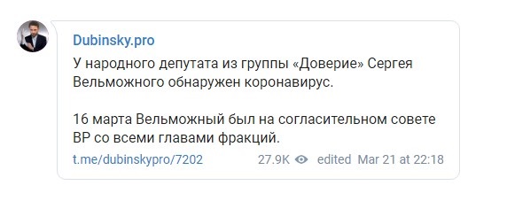 Як уточнив у Telegram нардеп Олександр Дубинський, 16 березня Вельможний знаходився на погоджувальній раді ВР разом з главами всіх фракцій.