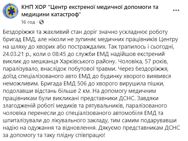 "О 08:45 у службу ЕМП надійшов екстрений виклик від жителя Харківського району. Чоловіка, 57 років, паралізувало в результаті побутової травми. Через бездоріжжя, під'їзд спеціалізованого авто ЕМП до будинку хворого виявився неможливим", - йдеться в повідомленні.