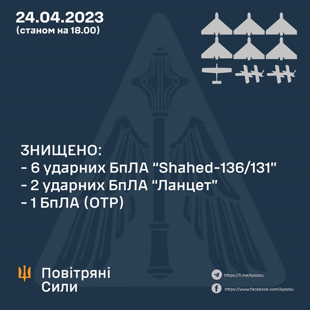 Знищено шість ударних Shahed-136/131, два ударні безпілотники Ланцет і один БпЛА оперативно-тактичного рівня.