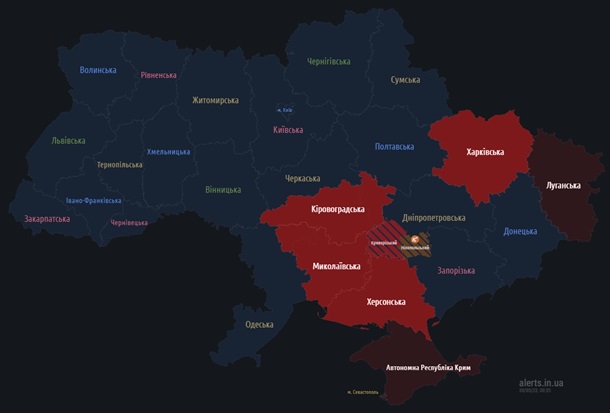 Спершу повітряну тривогу оголосили в Херсонській та Миколаївській областях, пізніше до списку "приєдналися" Кіровоградська та Харківська.