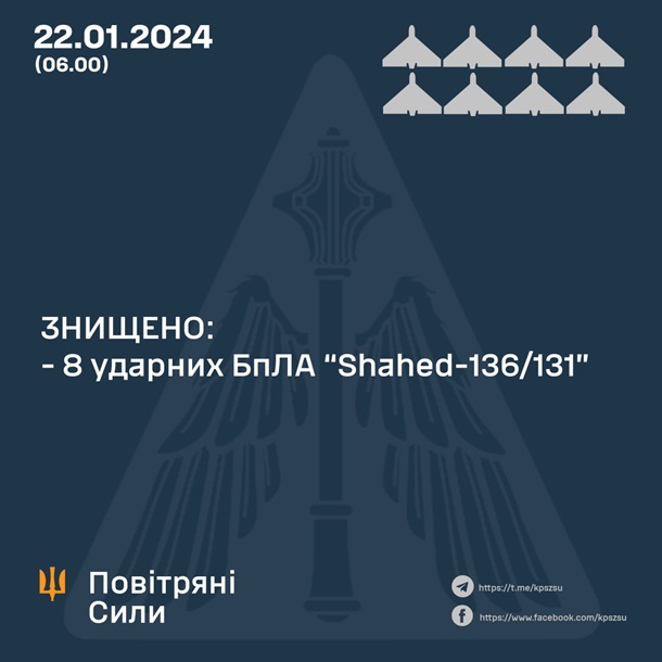 У ніч на 22 січня 2024 року ворог атакував Україну вісьмома ударними БпЛА типу Shahed-136/131, усі вісім збито.