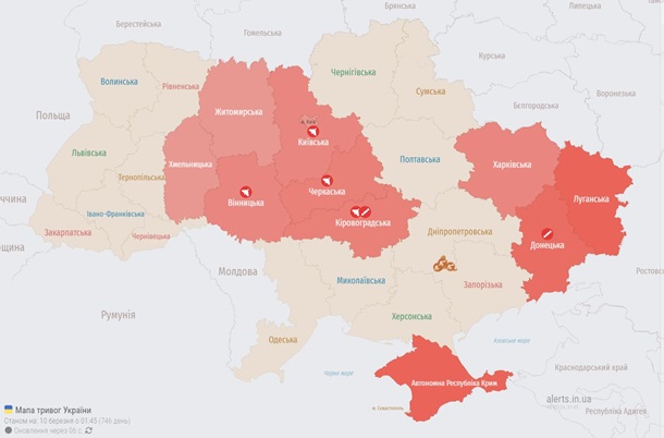 У ніч проти неділі, 10 березня, у низці областей, а також у Києві оголосили повітряну тривогу через атаку ворожих безпілотників. У соцмережах повідомляють про вибухи у Київській області.