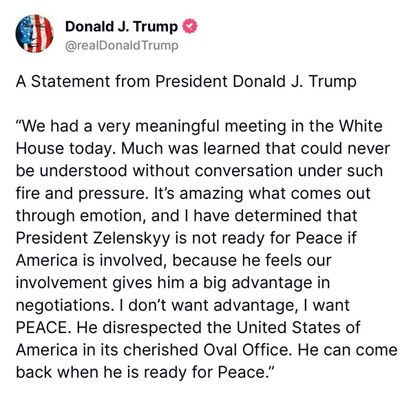 "Я не хочу переваги, я хочу МИРУ. Він виявив неповагу до Сполучених Штатів Америки у їхньому шанованому Овальному кабінеті. Він може повернутися, коли буде готовий до миру", - додав глава Білого дому.