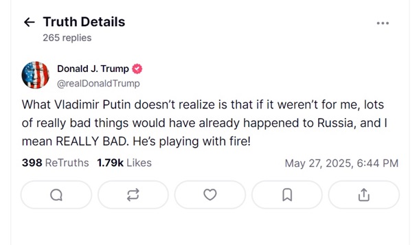 "Чого Володимир Путін не усвідомлює, так це те, що якби не я, то з Росією вже сталося б багато справді поганих речей, і я маю на увазі ДУЖЕ ПОГАНІ. Він грається з вогнем!", - написав президент США.
